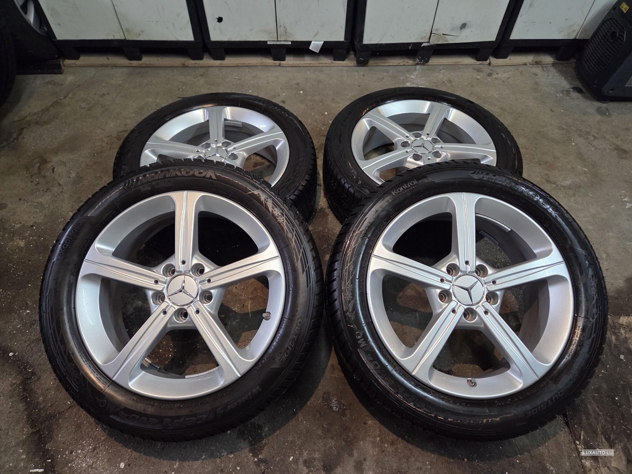 Je vends un kit hiver originale mercedes pour classe A, B , Cla Nouveau modele, 6.5x17 ET44 , avec 4 pneus 205/55R17 hankook de 2020, 2x pneus ok pour 1 hiver et 2x pneus comme neufs.
