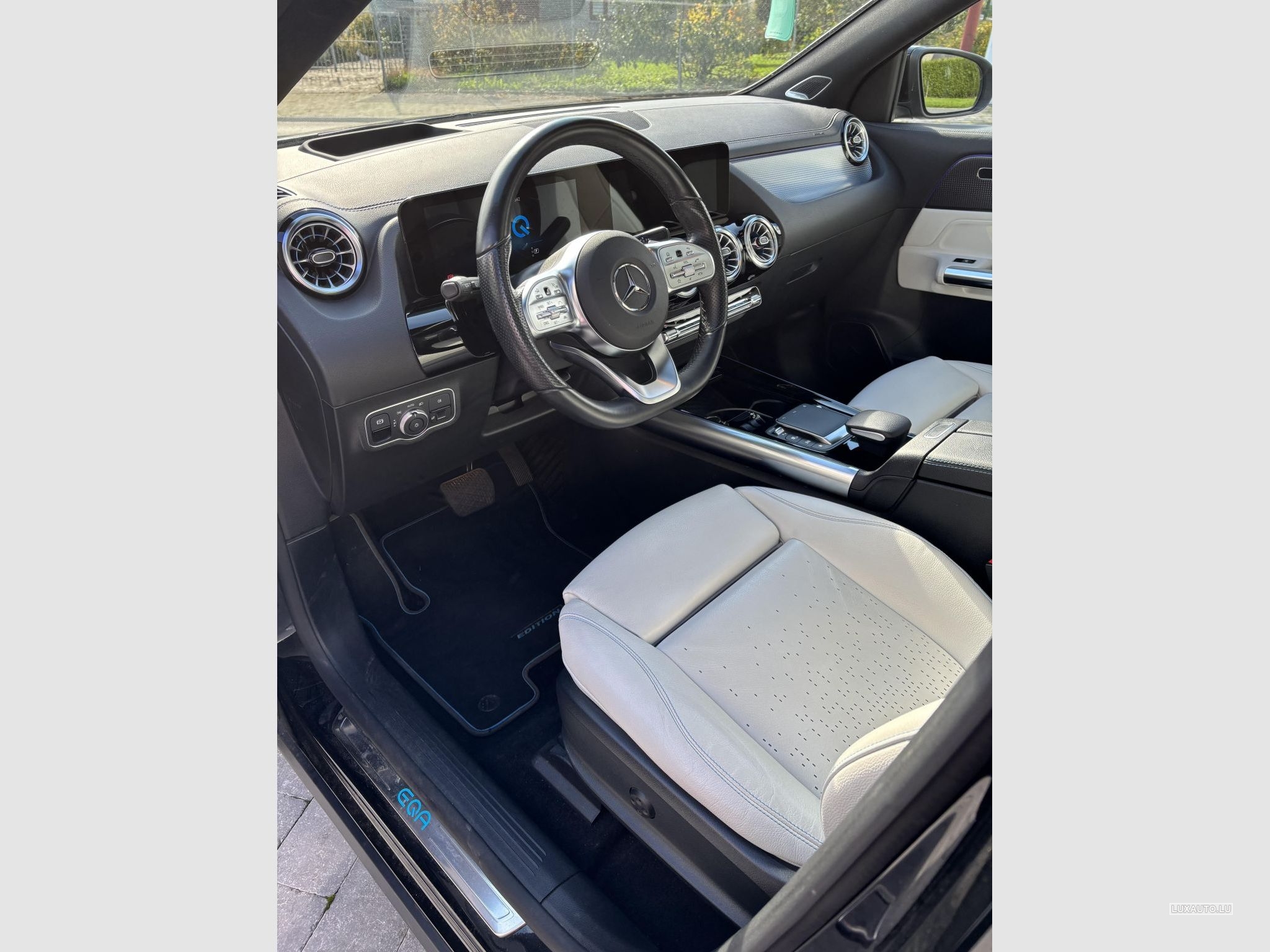 Mercedes EQA 250 AMG Line "Edition". Il s'agit d'une édition spéciale incluant l'extérieur noir métallisé, les jantes 20 pouces bronze, l'intérieur en cuir blanc perforé et la clé assortie noire et bronze.
