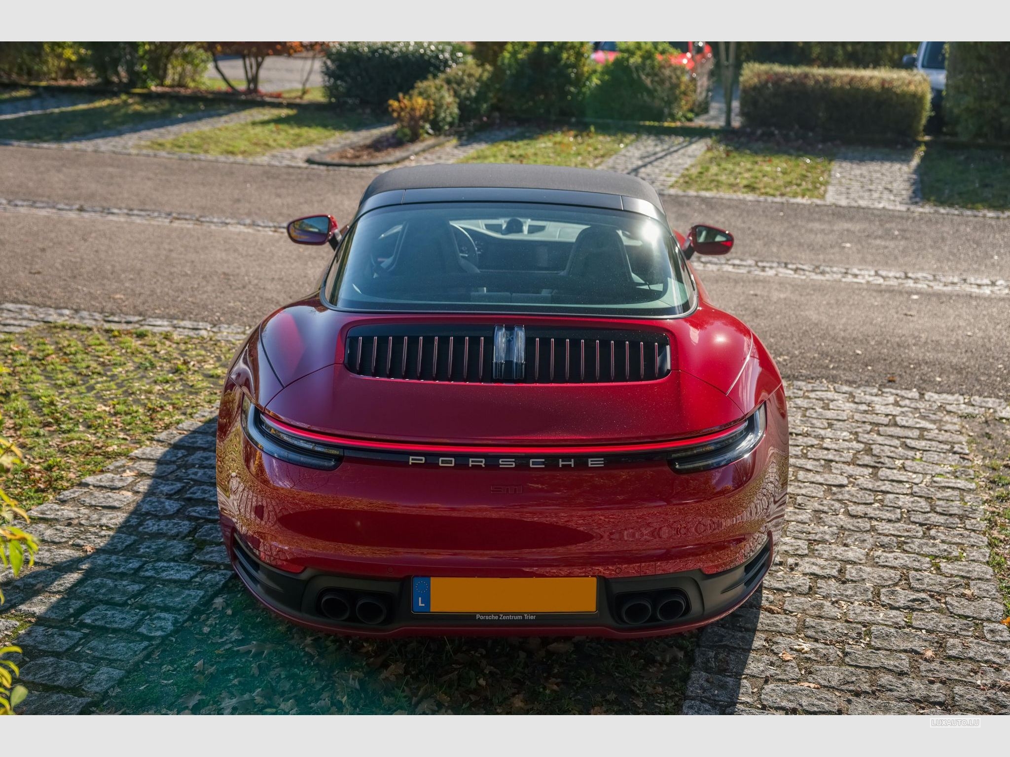 Carmine Red exterior, Black convertible top, Targa bar in black (silk gloss), Rear lid slats painted in exterior color, Exclusive Design taillights, Black sport tailpipes, 20-/21-inch Carrera Classic wheels, “911” logo painted in exterior color.